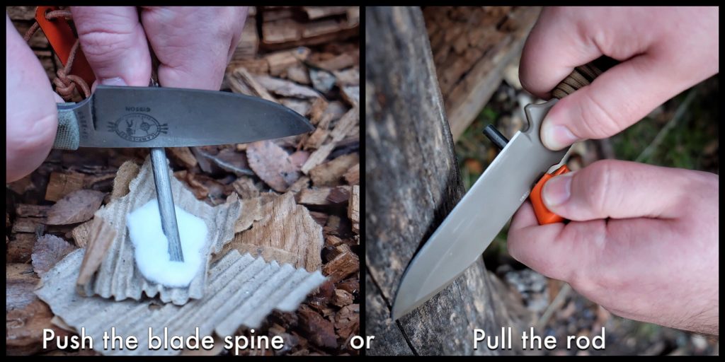 There are two schools of thought on how to maximize your rod scrapes: Moving the rod against the knife by pulling the rod up against the spine of the knife, and moving the knife against the rod by pushing the spine down the rod. It’s personal. You have to figure out what works for you, but I would say get proficient both ways. I use both methods depending on what I’m trying to light.
